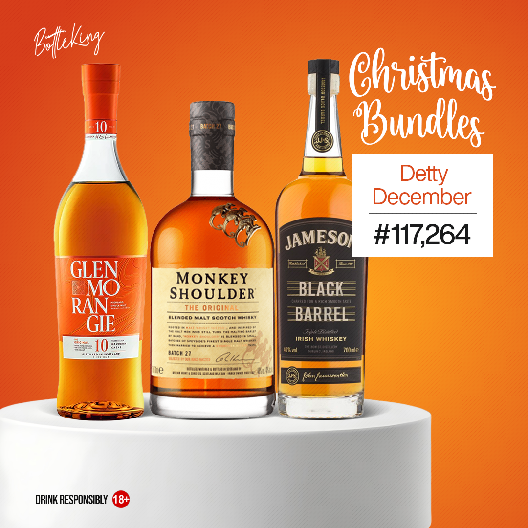 This is a collection of 3 of the best whisky brands. Glenmorangie highlighting the peach and honeysuckle note, Monkey Shoulder giving smooth malty profile, while Jameson Black Barrel offers butterscotch and caramel appeal especially to bourbon drinks. This combo is all you need to elevate your Detty December experience!